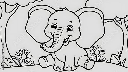 Fototapeta premium A delightful coloring page showcasing an elephant, a tree, and flowers, perfect for engaging in creative activities
