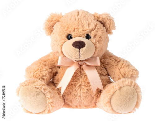 Fototapeta premium A delightful, light beige teddy bear sits calmly, adorned with a delicate,...
