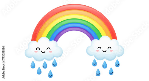 Obraz premium A delightful scene with a colorful rainbow arcing across the sky, anchored by smiling clouds and playful raindrops.