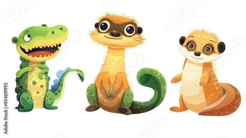 © Phatharaporn, Obraz premium A delightful trio of cartoon animals, including a crocodile, a meerkat, and a mongoose. The image is on a transparent background