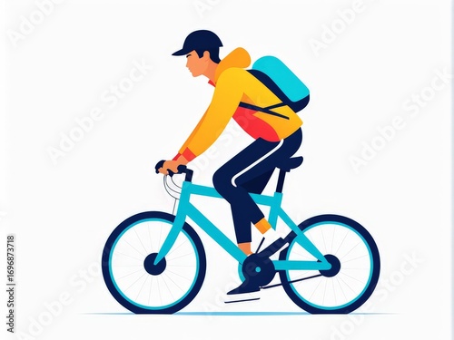 © Quantumo0o, Fototapeta premium A delivery person on a bicycle with a blue backpack