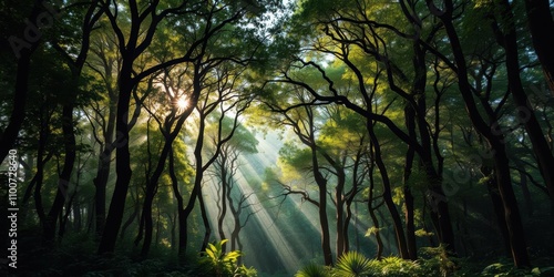 © Nasnunt, Obraz premium A dense and lush forest with sunlight filtering through the canopy, creating a magical and mystical atmosphere, sunlight, ancient