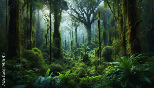 Obraz premium A dense and misty rainforest with towering trees and vibrant greenery, bathed...