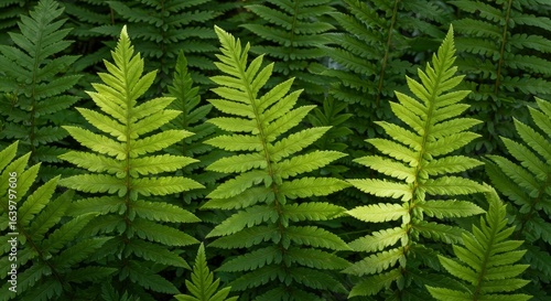 Obraz premium A dense arrangement of bright green fern fronds some brightly illuminated