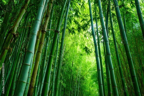 Fototapeta premium A dense bamboo forest with tall green stalks reaching up into the bright light