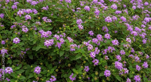 Naklejka premium A dense bush covered in small purple flowers and green leaves