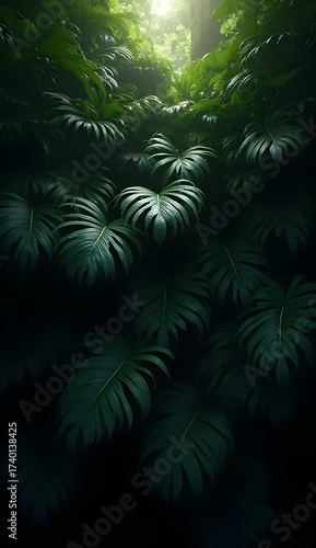 © Ari Akram, Fototapeta premium A dense cluster of dark green tropical leaves, layered densely to create a sense of depth. The leaves are varying shades of dark green, with a glossy and matte contrast. The sunlight peeks through the