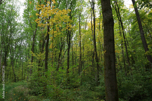 Naklejka premium ​A dense deciduous forest shows the beginning of autumn with a mix of vibrant...
