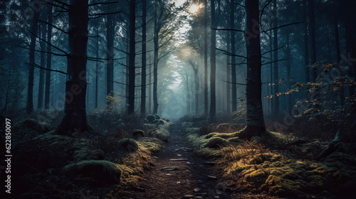 Fototapeta premium A dense, eerie forest with ancient, towering trees