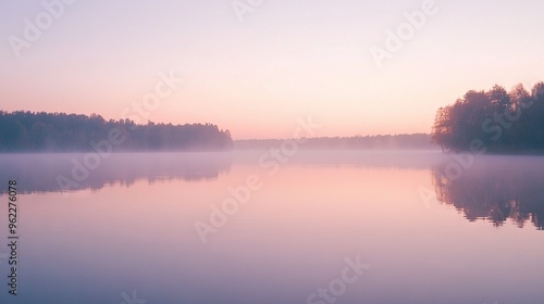 © Olga, Fototapeta premium A dense forest enveloped in fog surrounds a serene body of water