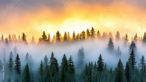 © Sergey, Obraz premium A dense forest glows as the setting sun’s rays filter through the towering trees
