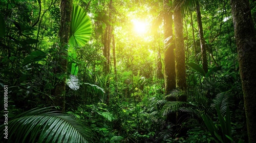 © Sonita, Obraz premium A dense forest landscape with towering trees, ferns, and sunlight streaming through the leaves.