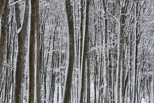 Obraz premium A dense forest of tall beech trees covered in fresh white snow during a cold...