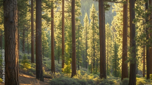 Naklejka premium A dense forest of towering pines dappled in sunlight, exuding a sense of...