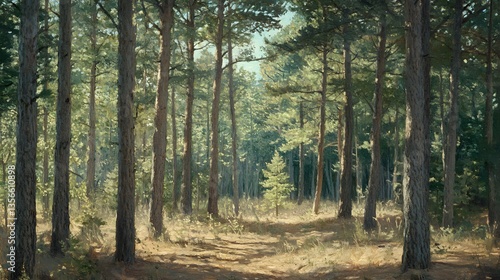 Obraz premium A dense forest of towering pines dappled in sunlight, exuding a sense of timeless tranquility.