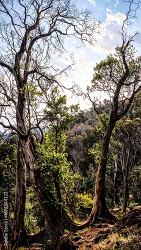 © Galang, Obraz premium A dense forest scene, showcasing intertwining tree trunks and branches against a backdrop of verdant foliage and a partly cloudy sky.