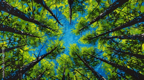 © Miswar, Obraz premium a dense forest, showcasing tall trees with bright green foliage against a vivid blue sky.