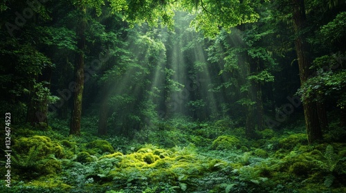 © Alex, Obraz premium A dense forest stretches across the landscape with towering trees forming a lush canopy overhead with sunlight filtering through