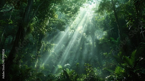 Obraz premium A dense forest with a single ray of sunlight piercing through the canopy,...