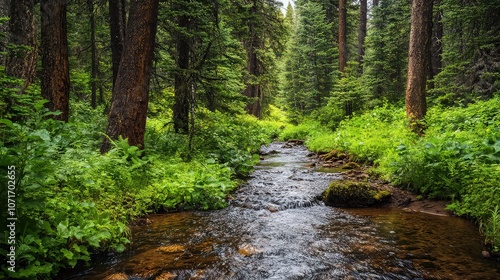 Obraz premium A dense forest with a small, sparkling creek running through it, providing...