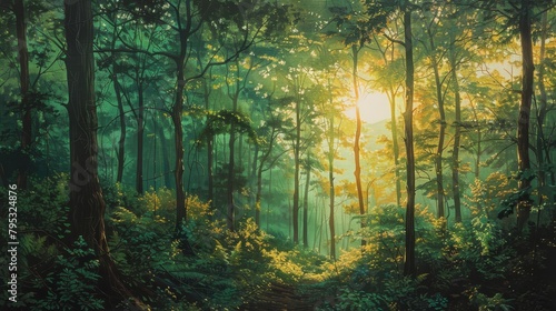 © Purichaya, Obraz premium A dense forest with green trees and sunlight shining through the trees.