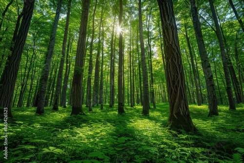Fototapeta premium A dense forest with sunlight filtering through the thick canopy, highlighting various shades of green and creating a serene, nature-filled atmosphere.