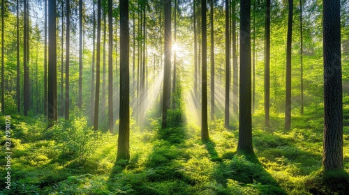 © sarun, Obraz premium A dense forest with tall, green trees, sunlight filtering through the leaves.