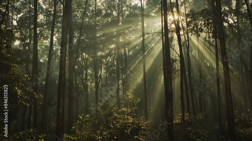 © Zidane, Fototapeta premium A dense forest with tall trees and sunlight filtering through the leaves.