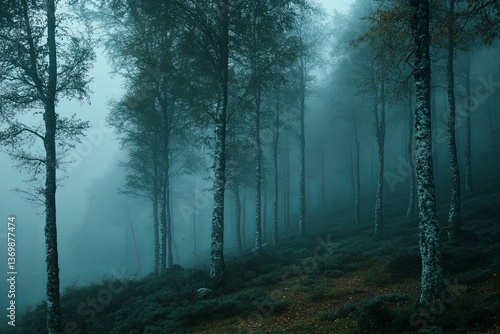 © Creative, Fototapeta premium A dense forest with tall trees enveloped in a mystical fog