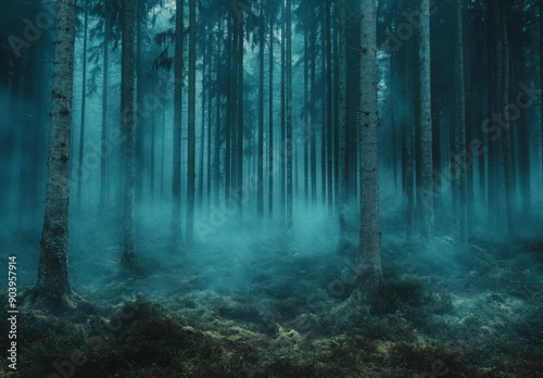 © Lucianastudio, Obraz premium A dense forest with tall trees shrouded in thick mist, creating an ethereal and mystical atmosphere