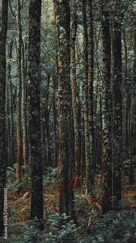 Obraz premium A dense forest with tightly packed trees and an ant nest visible among the...