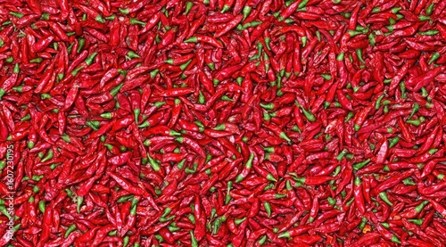 © Shobar, Fototapeta premium A dense, full frame view of numerous dried red chili peppers