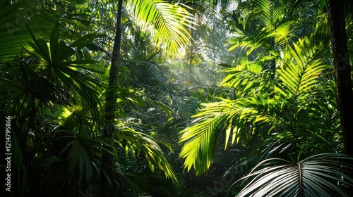 © Seak, Fototapeta premium A dense green forest with sunlight filtering through the leaves, casting soft shadows