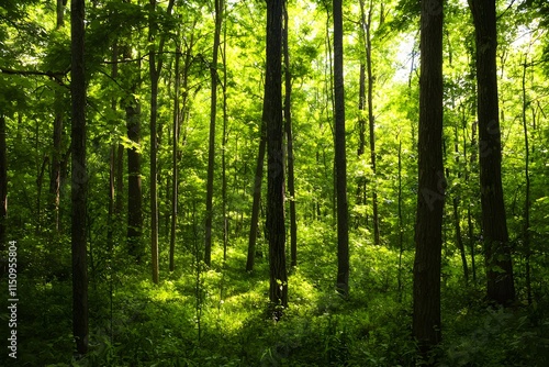Fototapeta premium A dense green forest with tall trees creating a tranquil atmosphere of natures beauty.