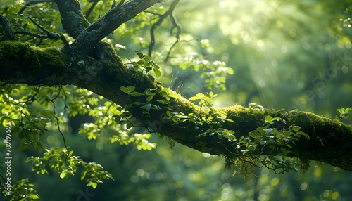 Fototapeta premium A dense green tree forest, where the tree branches are thickly covered with lush moss, offers a mysterious and natural ambiance, perfect for explorations and nature photography.