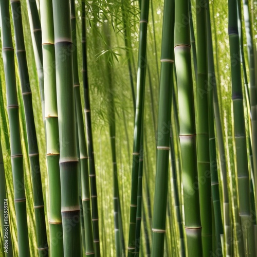 Fototapeta premium A dense grove of tall, slender bamboo stalks bathed in warm sunlight,...