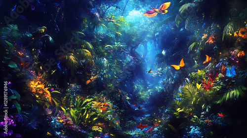 Fototapeta premium A dense jungle with vibrant green trees, thick foliage, and sunlight...