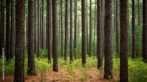 Fototapeta premium A dense pine forest features towering trees and a soft forest floor blanketed with pine needles, creating a serene and natural woodland environment.