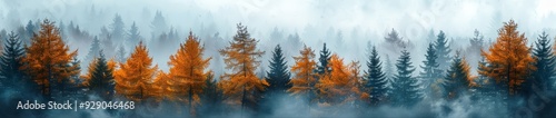Fototapeta premium A dense pine forest with mist rising from the trees, creating an ethereal and...