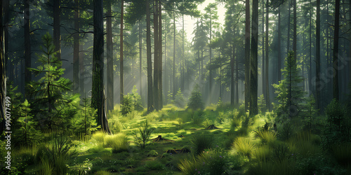 Obraz premium A dense pine forest with tall trees, sunlight filtering through the branches,...