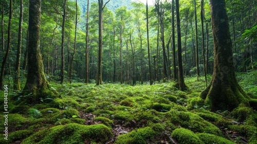 © Boonnam Burart, Fototapeta premium A dense rainforest campsite with lush vegetation and a moss-covered ground