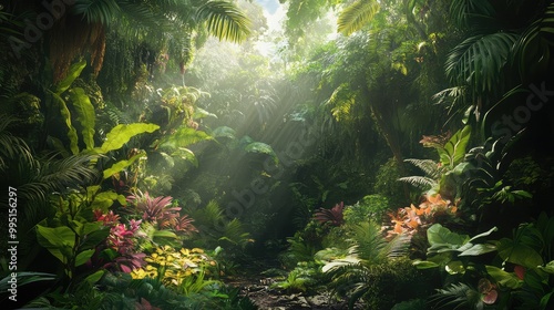 Fototapeta premium A dense rainforest with cascading vines and exotic plants