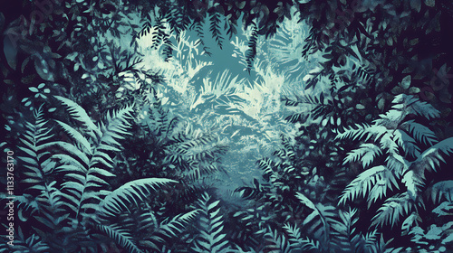 Fototapeta premium A dense thicket of brambles and ferns surrounds a hidden clearing in a mystical forest landscape, wetleafs, forestland. Thicket. Illustration