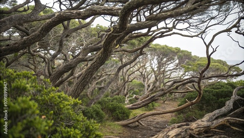 Obraz premium A dense thicket of twisted, gnarled tree branches, overgrown vegetation,...
