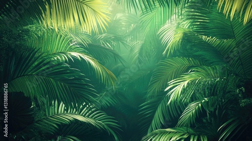 Fototapeta premium A dense tropical rainforest with an array of lush foliage and sun filtering through the fog.