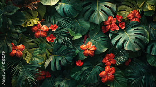 Naklejka premium A dense, vibrant jungle foliage, a lush tapestry of emerald and crimson...