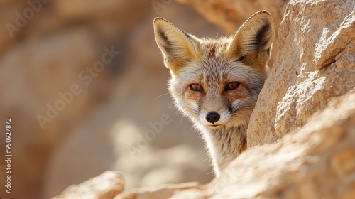 Fototapeta premium A desert fox peeking out from behind a rock, blending into the sandy...