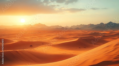 © ma, Fototapeta premium A desert landscape at sunset with orange-red sand dunes, clouds in the sky, and distant mountains illuminated by the setting sun.