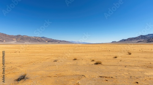 © Media Srock, Fototapeta premium A desert landscape with a clear blue sky. The sky is dotted with clouds, and the sun is shining brightly. The emptiness of the desert gives a sense of solitude and vastness