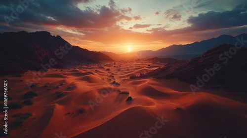 © Kanyanat, Fototapeta premium A desert landscape with a sun setting in the background